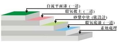 ⑥自流平面漆:用自流平型環(huán)氧面漆均勻鏝涂一道,完工后達(dá)到光亮潔凈,顏色均一,無(wú)空鼓;